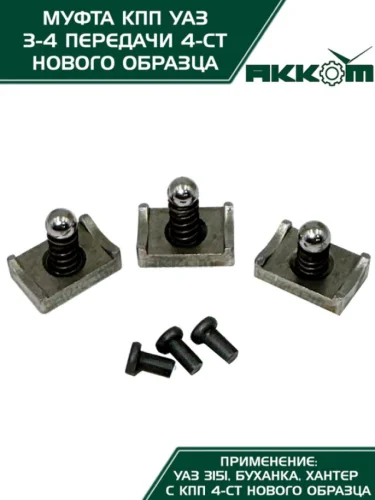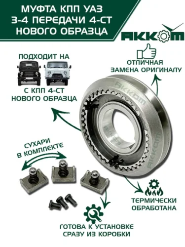| Наименование | Муфта КПП УАЗ 3-4 передачи НО в сборе АККОМ в Верхней Пышме Свердловской области |